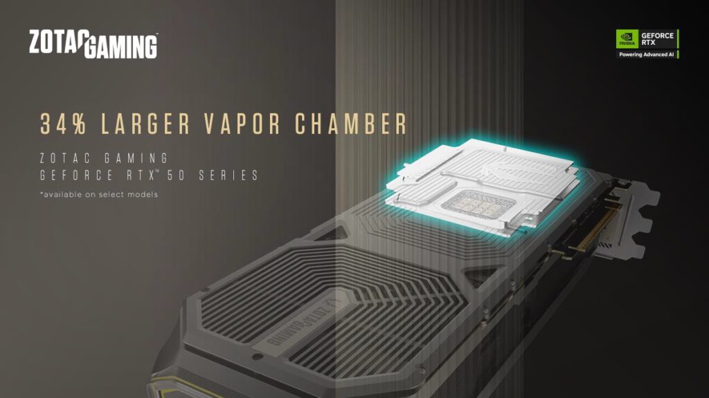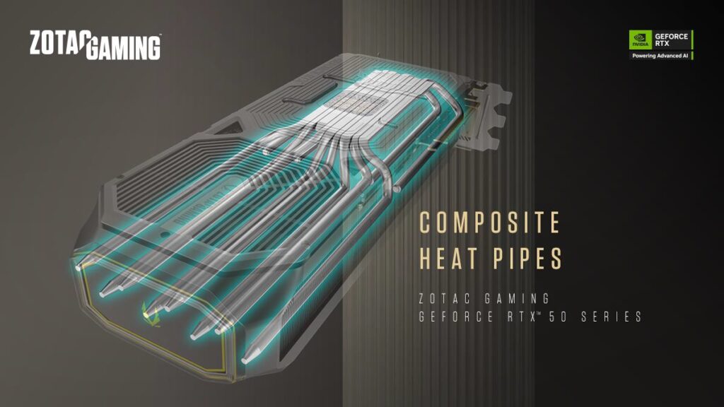 Seria kart graficznych ZOTAC GAMING GeForce RTX 50 wprowadza kolejne ulepszenia w konstrukcji termicznej dzięki zaawansowanemu systemowi chłodzenia IceStorm 3.0, który jest najpotężniejszym rozwiązaniem chłodzenia GPU w swojej klasie. Wyposażony w komorę parową większą o 34% w porównaniu do poprzedniej generacji, system ten łączy wysokowydajne wentylatory chłodzące, miedziane kompozytowe rurki cieplne oraz aluminiowy radiator na pełną długość karty. Dzięki temu IceStorm 3.0 pozwala procesorom graficznym na osiąganie maksymalnej wydajności przy zachowaniu niskiej temperatury, nawet pod dużym obciążeniem.