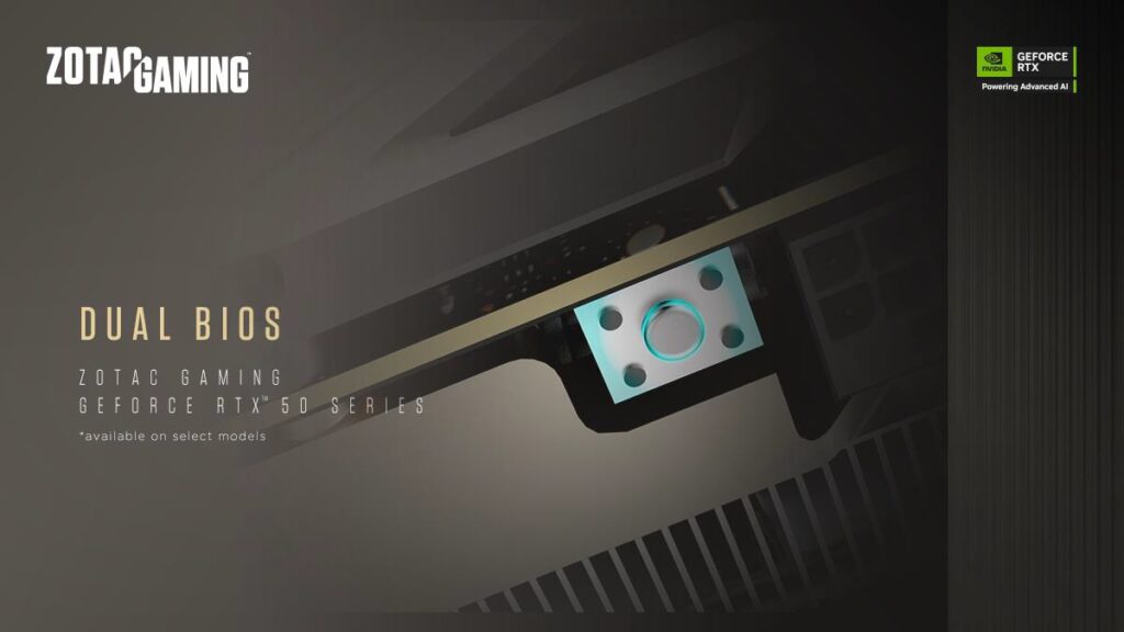 Funkcja Dual BIOS powraca w kartach graficznych ZOTAC GAMING GeForce RTX 50, oferując użytkownikom większą elastyczność. Za pomocą jednego przycisku fizycznego lub oprogramowania FireStorm można łatwo przełączać się między trybem maksymalnej wydajności a cichszą pracą, dostosowując kartę do swoich potrzeb.