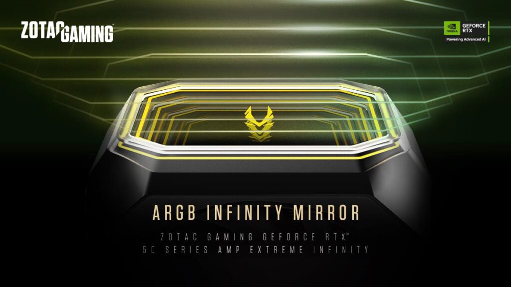 Dedykowany system oświetlenia SPECTRA 2.0 ARGB w kartach graficznych ZOTAC GAMING oferuje żywe kolory, które potęgują immersję w grach. Model AMP Extreme INFINITY, oprócz imponującego, trójstrefowego oświetlenia, które można w pełni dostosować do własnych preferencji, wyróżnia się również efektowną konstrukcją lustra nieskończoności, idealnie wpisującą się w motyw nieograniczonych możliwości tej generacji.