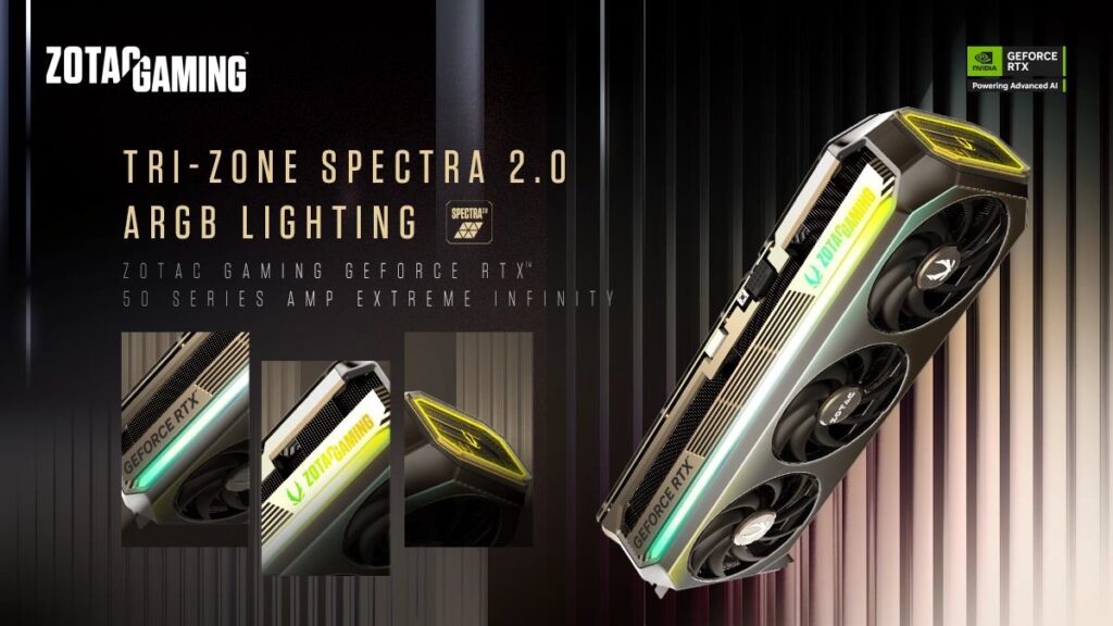 Z myślą o graczach, którzy cenią sobie jednolite oświetlenie w swoich komputerach, wybrane modele kart graficznych z serii 5090, 5080 i 5070 Ti zostały wyposażone w interfejs SPECTRA Link. Dzięki połączeniu kablowemu GPU z kompatybilną płytą główną RGB, użytkownicy mogą synchronizować efekty świetlne między płytą główną a kartą graficzną, tworząc spójny efekt wizualny.