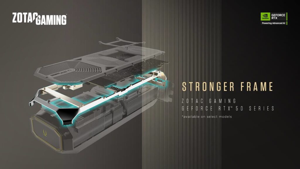 Karty graficzne z serii ZOTAC GAMING GeForce RTX 50 łączą estetykę z wytrzymałością. Solidność konstrukcji zapewniają odlewana ciśnieniowo metalowa płyta tylna, wspornik retencyjny oraz wzmocniona centralna część ramy, które dbają o integralność strukturalną. Modele wyposażone w 3 wentylatory zawierają także metalową podstawkę pod GPU, oferując dodatkowe wsparcie i stabilność.